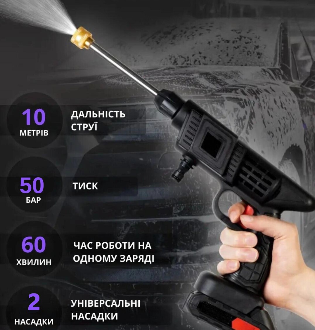Вона легко поміщається у багажнику вашої автівки, швидко заряджається та безперебійно працює до 60 хвилин на максимальній потужності. З нею, Ви зможете помити свою машину на дачі, у дворі, на природі.