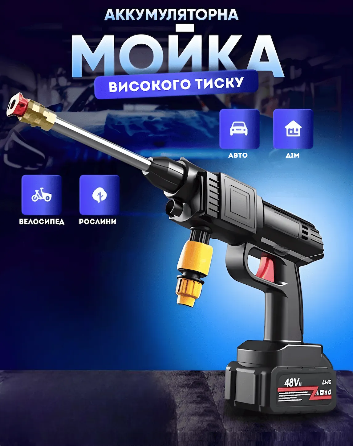 Автомийка оснащена літієвою акумуляторною батареєю ємністю 24 000 mah з тривалим терміном служби.